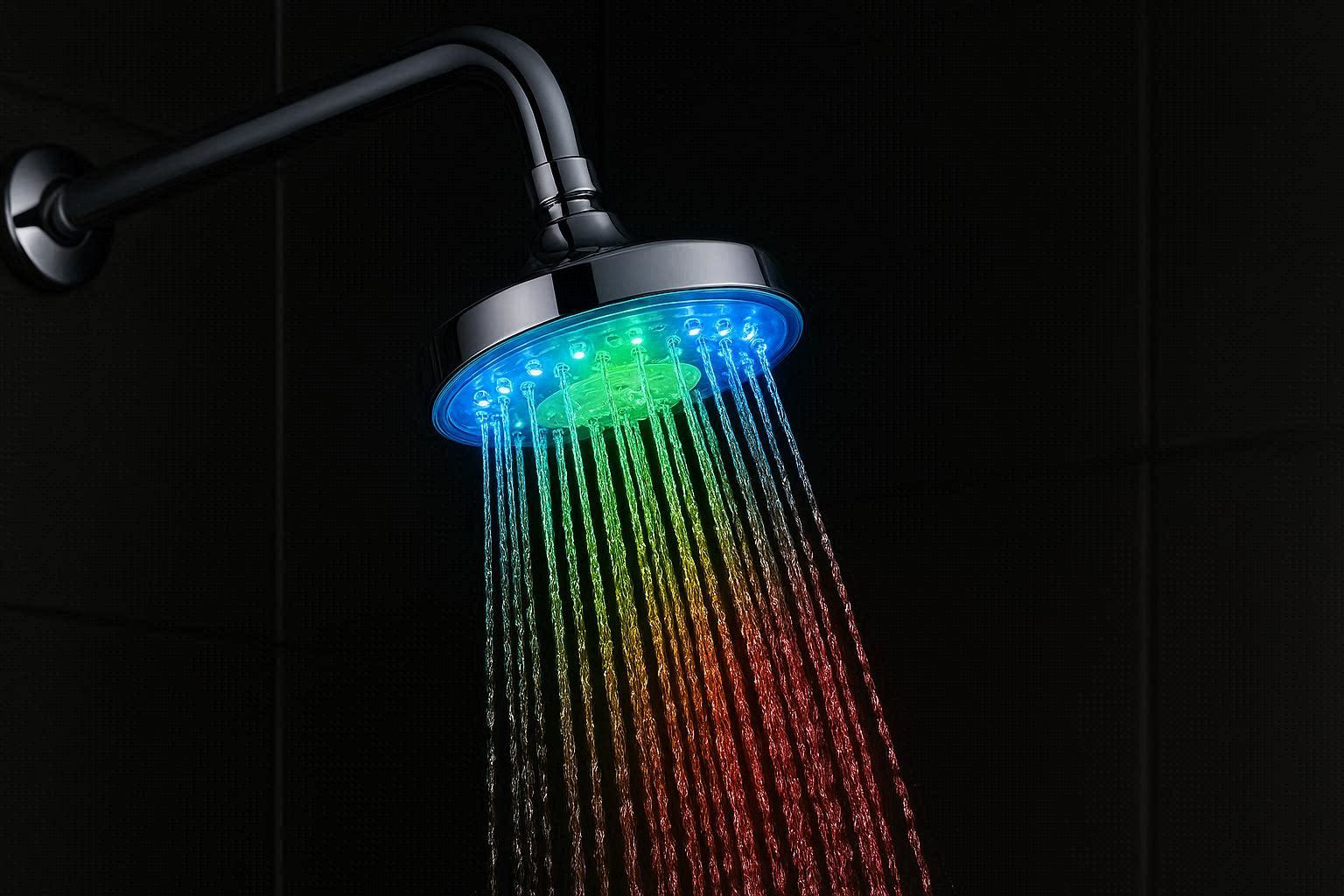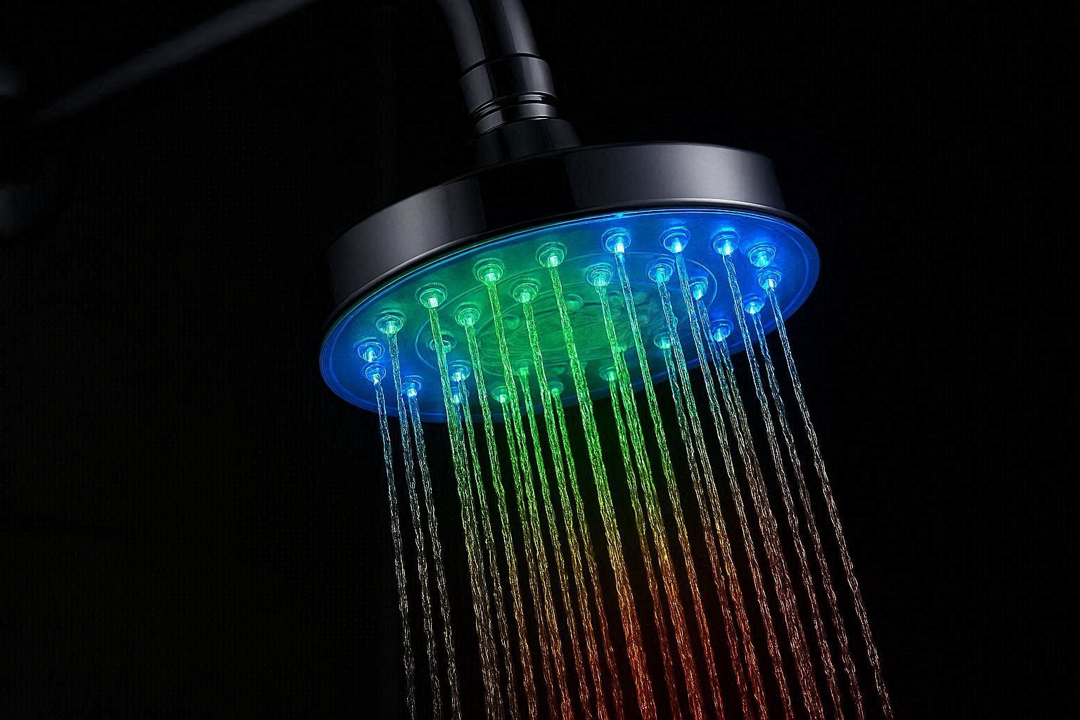 LED Color Changing Shower Head Powered By Water Flow For Temperature Sensing And Visual Ambiance
