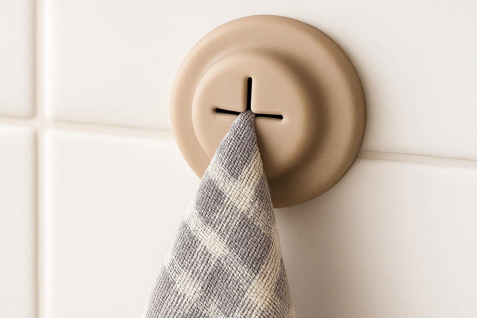 Experience a new way to hang towels with our innovative silicone self-adhesive towel plug, which uses a cross-shaped slit to hold fabrics. Simply push your towel or dishcloth into the soft silicone center with one finger, and it will stay securely held until you are ready to pull it out again.