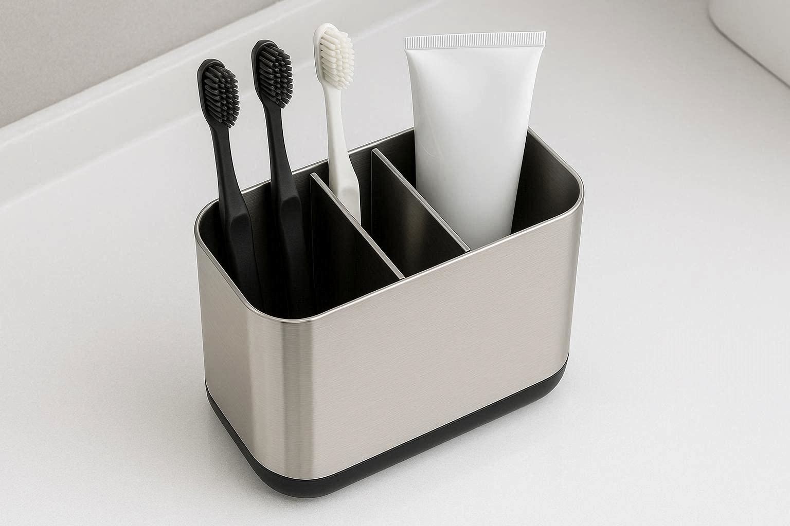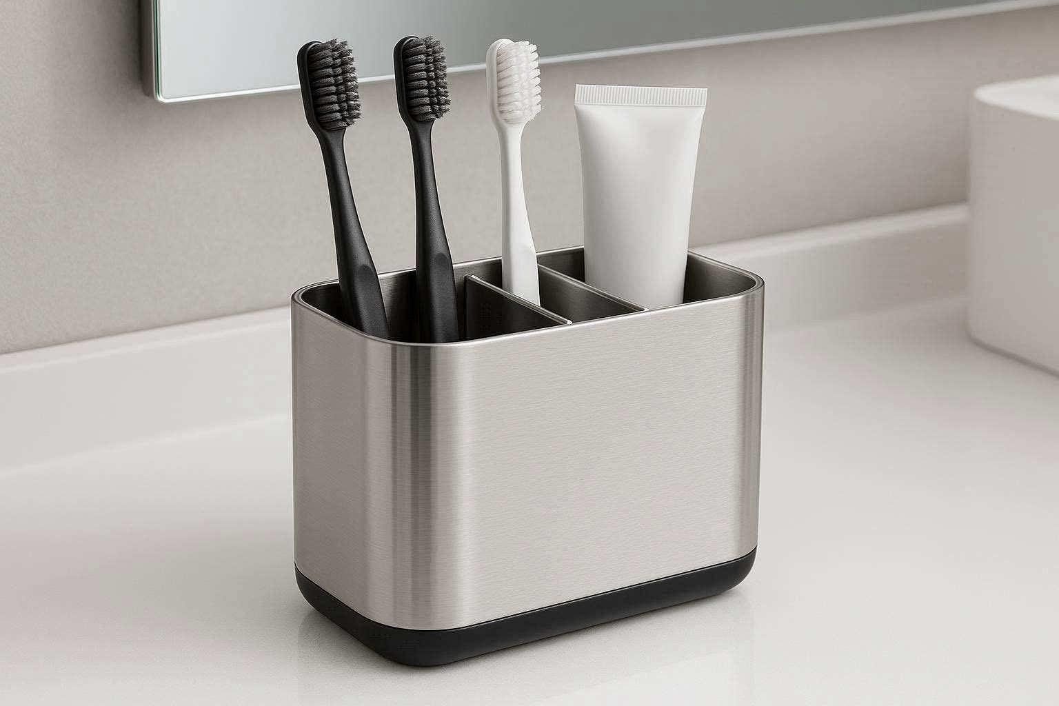 Sleek Stainless Steel Toothbrush Caddy With Removable Dividers For Easy Cleaning And Modern Vanity